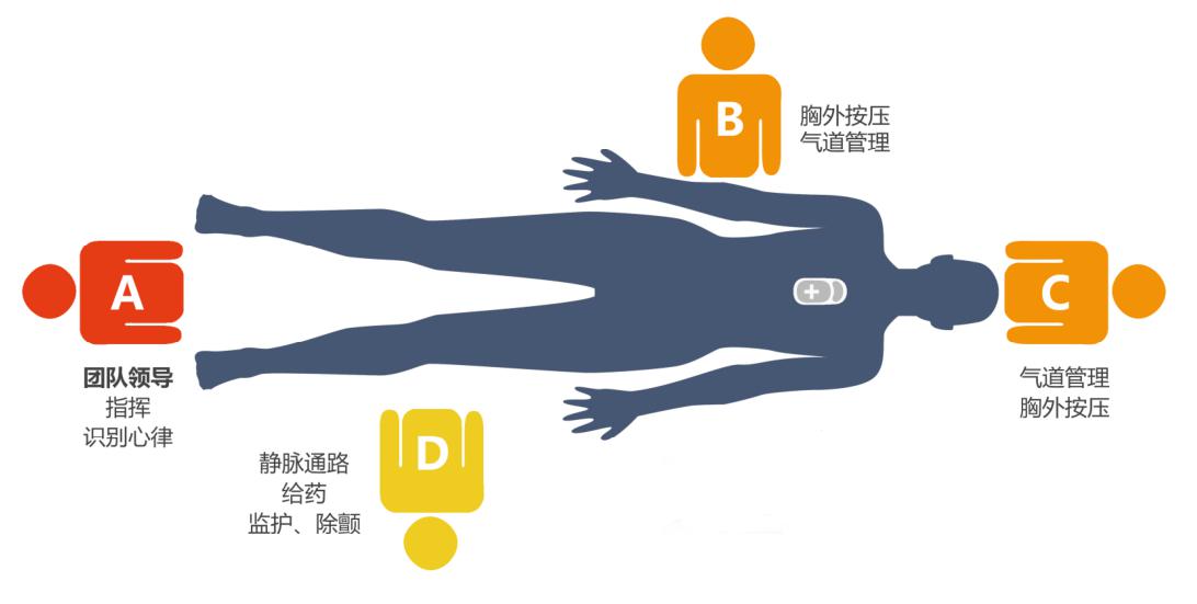 1.2 试验方法与流程64名实验人员按照医护职业分别分进角色分工组与未角色分工组,每组各8队,每队4人。角色分工组每队分别指定:A为队长,B为一助,C为二助,D为三助。其各自角色主要分工:A评估患者,组织抢救,下达指令;B负责胸外心脏按压及呼吸囊辅助通气;C负责气道管理,交替进行胸外心脏按压;D负责连接心电监护仪和电除颤、建立静脉通路、静脉给药、准备吸痰及记录(图 1)。讲解、现场演练、点评纠错等方式进行Pit-Crew CPR培训,培训合格后方可参加实验。而未角色分工组除了不指定队长及角色分工外,其余培训流程均与角色分工组相同。