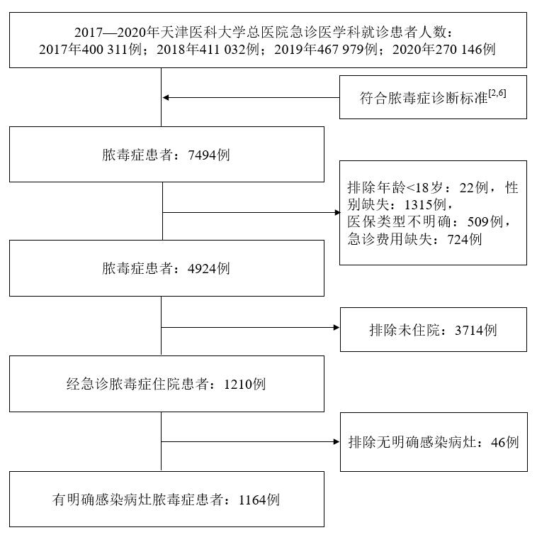 纳入标准:(1) 符合2016年脓毒症国际诊断标准及2020年《中国脓毒症早期预防与阻断急诊专家共识》 [2, 6];(2) 年龄≥ 18岁;(3)ED就诊患者性别、年龄、医保类型和ED费用指标完善;(4) 经ED诊断脓毒症,并收治住院的脓毒症患者,住院时间超过24 h;(5)ED就诊或住院患者在2017年1月1日至2020年12月31日期间同时办理完住院和出院。排除标准:住院死亡患者经分析为非脓毒症原因引起。