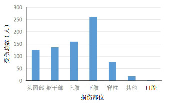 2.2 损伤部位在773例患者中,损伤部位(一人多发伤时,按部位统计人次)排前五的分别是下肢261例(32.04%)、上肢159例(20.37%)、躯干137例(17.57%)、头面部126例(16.16%)、脊柱76例(9.74%),见图 1。