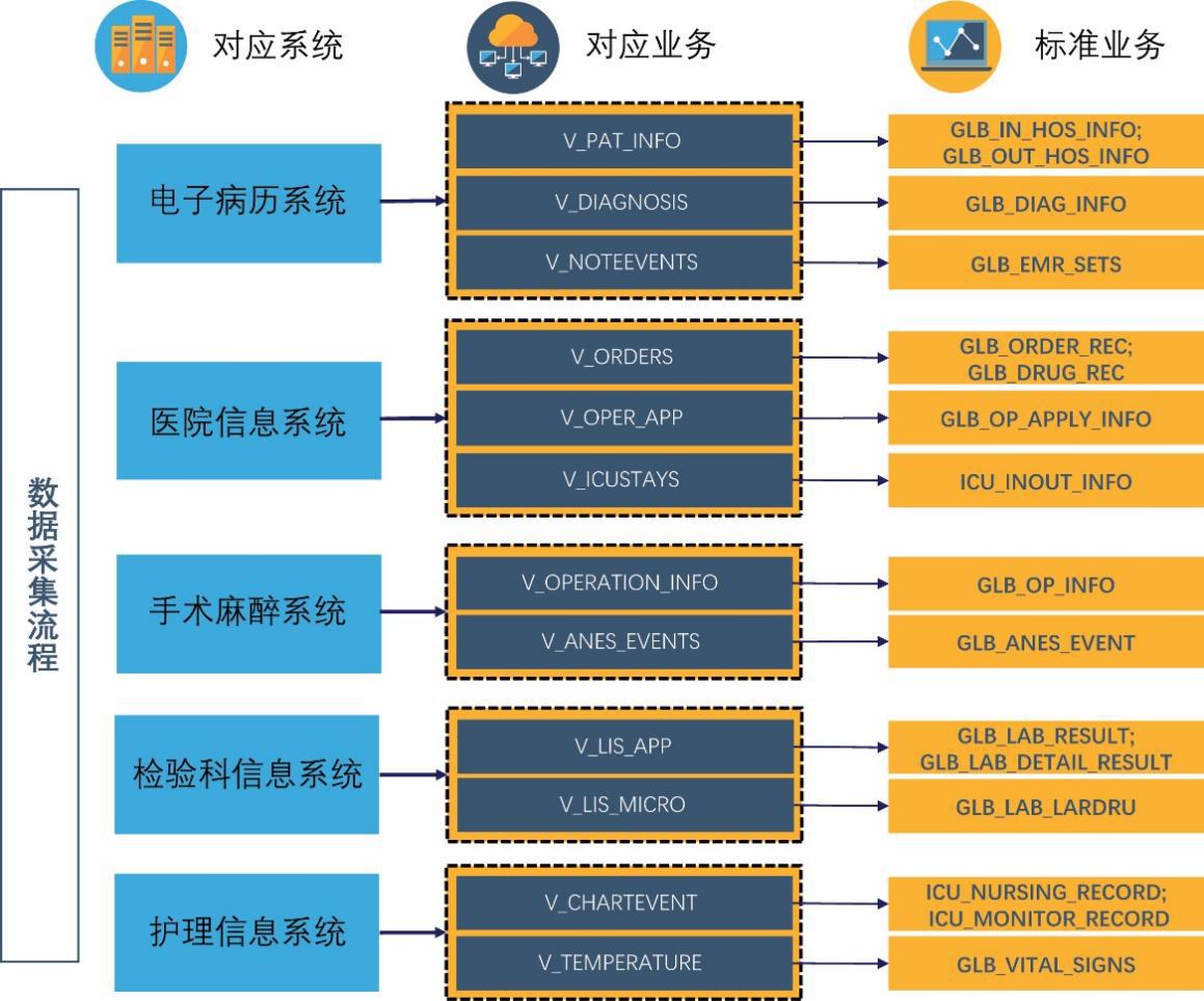 1.3 数据来源数据主要包括重症患者在院期间的全过程资料,主要来源包括医院信息系统、电子病历系统、监护信息系统、检验信息系统、放射信息系统、手术麻醉临床信息系统等。