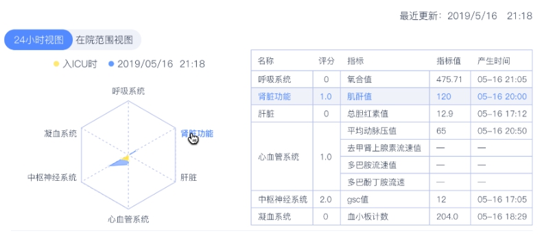 SOFA评分系统临床效果展示如图 3和图 4所示,包含评分时各项指标的具体评分以及每日SOFA评分的变化曲线。同时,SOFA自动化评分系统还通过雷达图可视化地表现各个脏器在入院时及当下的评分情况,可直观了解患者病情变化的情况。
