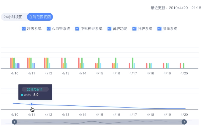 图 4 SOFA评分柱状图及趋势图界面展示效果 |