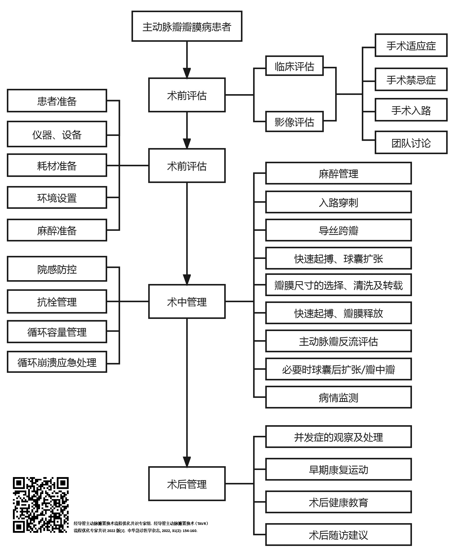 经导管主动脉瓣置换术(transcatheter aortic valve replacement,TAVR)又称经导管主动脉瓣植入术(transcatheter aortic valve implantation,TAVI),是指将组装完备的人工主动脉瓣经导管置入到病变的主动脉瓣处,置换原有主动脉瓣,在功能上完成主动脉瓣的替代[1]。近年来,TAVR已经成为老年主动脉瓣狭窄(aortic stenosis,AS)患者的一线治疗方案,为原本失去外科手术机会的老年患者提供了一种新的选择。据统计,我国75岁以上人群AS的发病率约为4%,约190万,其中具有指征需要进行TAVR治疗的患者量达50万,然而仅1.2%得到治疗[1-2]。截至2020年我国TAVR手术量累计超过6 000例[3],其中85%以上选择经股动脉路径该手术路径操作简单易行,但离心脏位置较远、手术耗时相对较长、过程中可能发生血管穿刺置入大管径动脉鞘管时支架移位、脱落等意外事件[4-5]。伴随TAVR技术的快速发展,相关的医护工作也愈加体现出独有的专科特色,提高TAVR的疗效是所有医务工作者面临的重要课题。目前的TAVR共识与指南,其证据仅局限于医疗技术、医学影像、康复等领域,尚缺乏TAVR流程优化相关的证据指导临床实践[6-8]。为了促进TAVR在我国规范、快速发展,现特邀多家中心的相关学科专家组,共同编写《经导管主动脉瓣置换术(TAVR)流程优化专家共识2022版》。