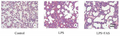 LPS组与Control组对比,肺组织体积显著增大,颜色呈深褐色,可见散在出血点及出血灶。LPS组HE染色示:肺泡数量明显减少,肺间隔水肿增厚,大部分肺泡结构消失或融合。肺泡腔内可见大量红细胞渗出,局部有透明膜形成,可见大量以中性粒细胞渗出为主的炎性细胞浸润。FAS+LPS组肺体积显著减小,出血点及出血灶较少。FAS+LPS组HE染色示:肺泡结构较为完整,肺泡数量明显增多,局部肺间质增厚和水肿,炎细胞和红细胞的浸润程度也有所减轻。见图 1。