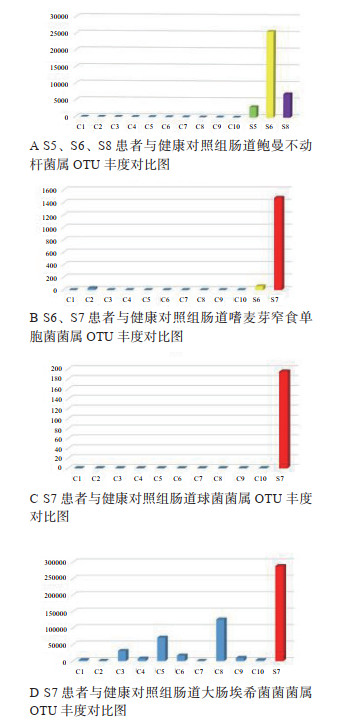 2.3 脓毒症患者临床感染致病菌与肠道相应致病菌属变化一致性观察分析脓毒症组患者中S5、S6、S7、S8号脓毒症患者痰培养阳性,S7患者血培养阳性。痰培养结果:鲍曼不动杆菌(患者编号为S5、S6、S8)、嗜麦芽窄食单胞菌(患者编号为S6、S7)、肠球菌属(患者编号为S7);血培养为大肠杆菌(患者编号为S7)。由图 1可见临床细菌培养阳性的脓毒症患者其肠道菌群中已有相应菌属比例升高。