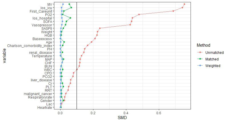 1.3 统计学方法采用R(v4.1.1)进行数据统计分析,正态性连续性变量采用均数±标准差(x±s),非正态分布连续性变量以中位数(四分位数[M(Q1, Q3)]表示,分类变量以百分比(%)表示。组间比较的分类变量选择采用χ2检验或Fisher精确检验,连续性变量则根据情况选择成组t检验或Mann-Whitney U检验。选取变量与临床相关和单因素分析(P<0.1)的变量纳入多元逻辑回归模型(包括:年龄,体重,ICU类别,SAPSⅡ、SOFA、CCI评分,充血性心力衰竭,肝脏疾病,肾脏疾病,恶性肿瘤,WBC,HGB,PLT,BUN,Cr,T,HR,MAP,RR,Lac,pH,Baseexcess,使用血管活性药物、机械通气、肾脏替代治疗,住ICU和住院时间),缺失值填补后行多元逻辑回归分析,行倾向性匹配评分(PSM)和逆概率加权(IPTW)[6]稳健研究结论。运用逻辑回归模型来计算倾向性得分,利用R的Matching包近邻匹配,创建IPTW模型,两组变量的标准平均差(SMD<0.1)来评价PSM和IPTW的效果(图 1)。