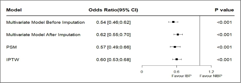 多元逻辑回归提示IBP组脓毒症患者28 d病死率更低(16.6% vs. 25.3%)(OR=0.54,95%CI 0.46~0.62,P<0.001),在对缺失值填补,PSM和IPTW后,结果依然稳健(表 2,图 2)。