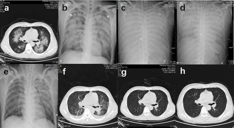 | A:中毒后入院时胸部CT;B:中毒后行ECMO前胸部X线摄片;C:中毒后2 d胸部X线摄片; D:中毒后4 d胸部X线摄片; E:中毒后8 d胸部X线摄片; F:中毒后13 d胸部CT; G:中毒后29 d胸部CT;H:中毒后127 d胸部CT 图 1 病例2中毒后胸部影像学的动态变化 Fig 1 Dynamic changes of chest imaging after poisoning in case 2 |