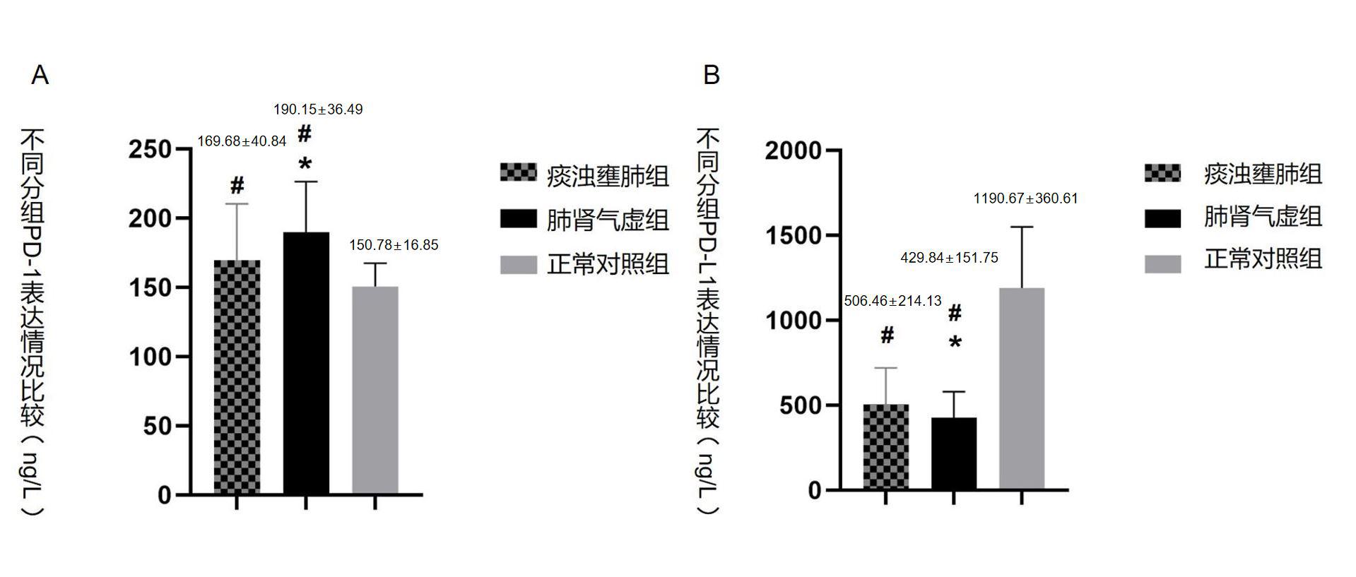 1.3 研究方法本研究将符合中西医诊断标准、纳入标准的患者收集入组,共105例,其中肺肾气虚证患者54例,痰浊壅肺证患者51例。同时从本院体检门诊收集与本研究相同年龄段明确无慢性阻塞性肺疾病并符合本研究其他入选标准的志愿者20例为对照组。采集符合入选标准的患者及对照组的血液标本,采用酶联免疫吸附测定方法(ELISA)进行血清PD-L1、PD-1浓度测定。试剂盒品牌为XLPCC,上海鑫乐生物科技有限公司。