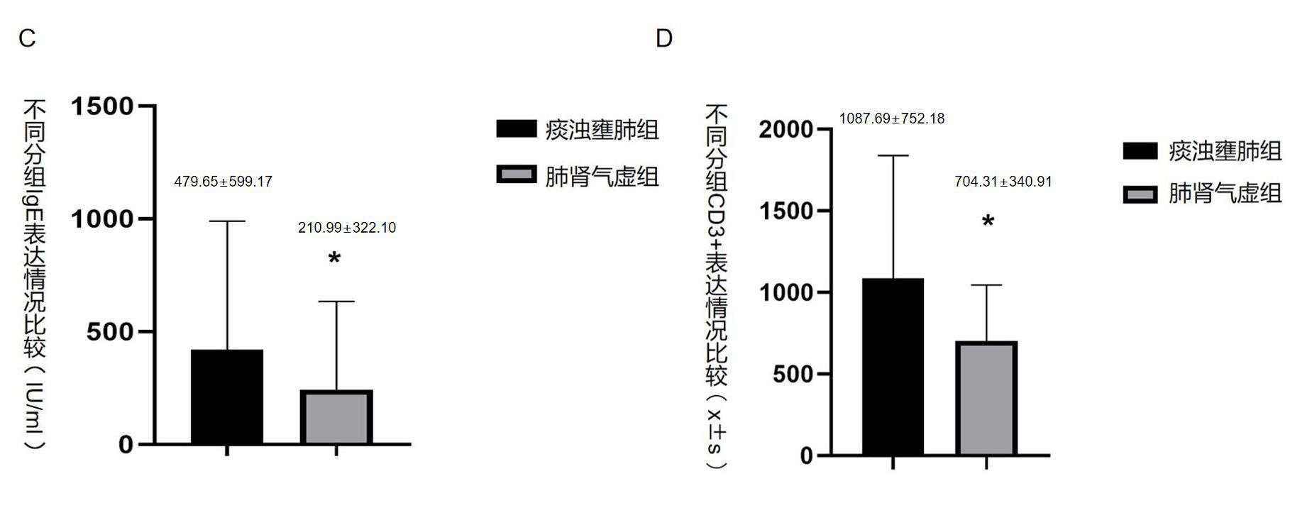 与痰浊壅肺组比较,肺肾气虚组IgE表达显著降低(P < 0.05)(图 2C),而肺肾气虚组IgA、IgM、IgG、C3、C4表达差异无统计学意义(P>0.05),见表 2。