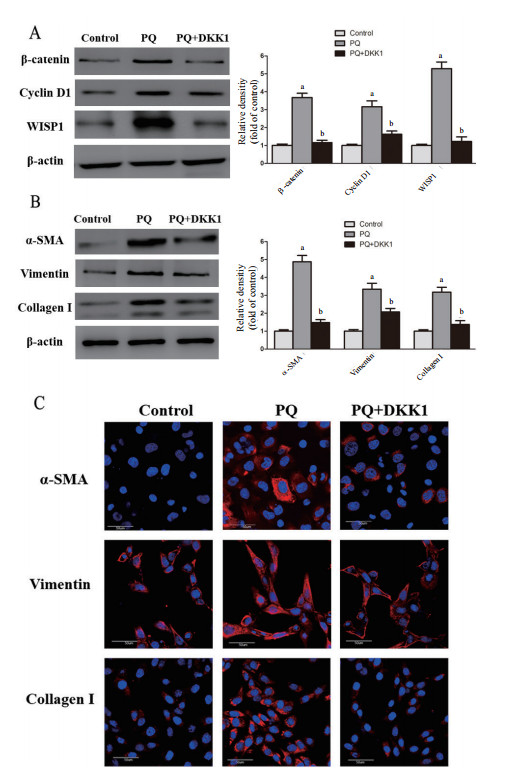 同时采用PQ(50 μmol/L)和DKK1(10 ng/mL)处理细胞进一步分析抑制Wnt信号通路对MRC-5转分化的影响。采用Western Blot方法检测β-catenin、Cyclin D1和WISP1的表达水平,结果如图 3A所示,与PQ组细胞相比,PQ+DKK1组细胞中β-catenin、Cyclin D1和WISP1的表达受到抑制(P < 0.05);采用Western Blot和免疫荧光检测成纤维细胞转分化过程相关标记物α-SMA、Vimentin和Collagen I的表达变化情况,结果如图 3B和3C所示,与PQ组相比,PQ+DKK1组细胞中α-SMA、Vimentin和Collagen的表达受到抑制(P < 0.05)。