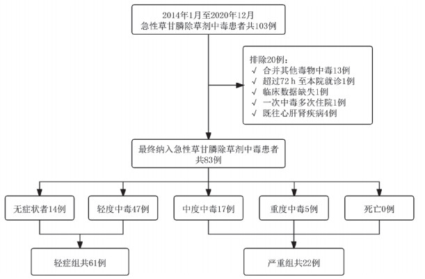 2 结果2014年1月至2020年12月共收治急性GBHs中毒103例,按照排除标准筛选后最终纳入83例患者。其中无症状14例(16.9),轻度中毒47例(56.6%),中度中毒17例(20.5%),重度中毒5例(6.0%),死亡0例(0%)。无症状与轻度中毒者纳入轻症组,共61例;中度、重度中毒及死亡者纳入严重组,共22例(图 1)。