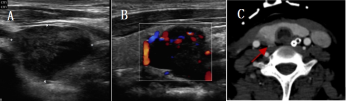 A、B:多普勒超声示右侧甲状腺下极下方2.3 cm× 1.5 cm低回声;C:颈部CT示右侧甲状腺后方结节(箭头所指部分) 图 1 甲状旁腺术前影像学定位检查 |