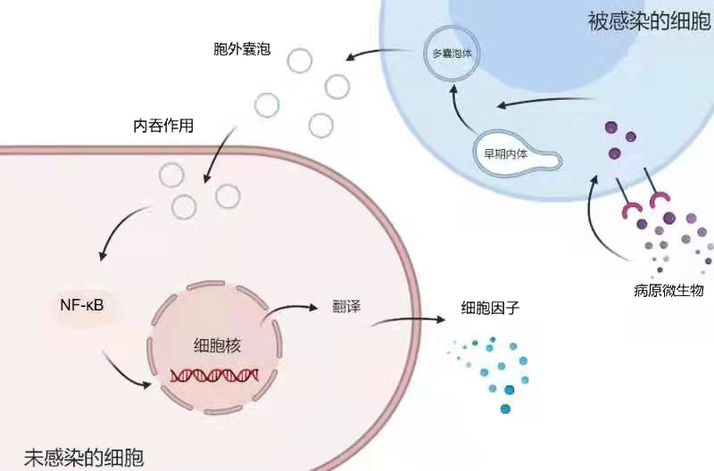 1.4 EVs与固有免疫细胞巨噬细胞是机体固有免疫系统的第一道防线,病原菌侵入机体后,病原体相关分子模式与巨噬细胞的模式识别受体相结合,巨噬细胞向M1型极化,通过吞噬作用吞噬并杀灭病原体[18]。Oliveira等[19]研究发现,鼠巨噬细胞可以吞噬新生隐球菌来源的EVs,两者共孵育后,细胞上清液中IL-10、TGF-β及TNF-α水平增高。同样地,耐甲氧西林金黄色葡萄球菌释放的EVs中携带成孔毒素及脂蛋白,与巨噬细胞共孵育后可以激活Toll样受体2及NLRP3,从而调控下游的凋亡相关斑点样蛋白及半胱氨酸天冬氨酸蛋白酶-1,引起细胞焦亡,并且促进IL-1β及IL-18的释放[20]。病原微生物侵入宿主细胞后,被感染的细胞释放的EVs与未感染细胞之间的相互作用如图 1所示[7-8]。