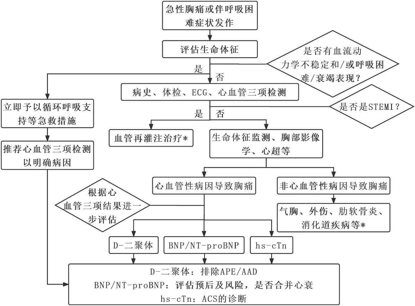 推荐意见1:针对表现为急性胸痛或伴呼吸困难的急诊首诊患者,除常规ECG外,推荐hs-cTn、D-二聚体、BNP/NT-proBNP心血管三项标志物的检测,以便对患者进行鉴别与诊断、危险分层、预后评估和治疗决策。【推荐级别:强推荐】
