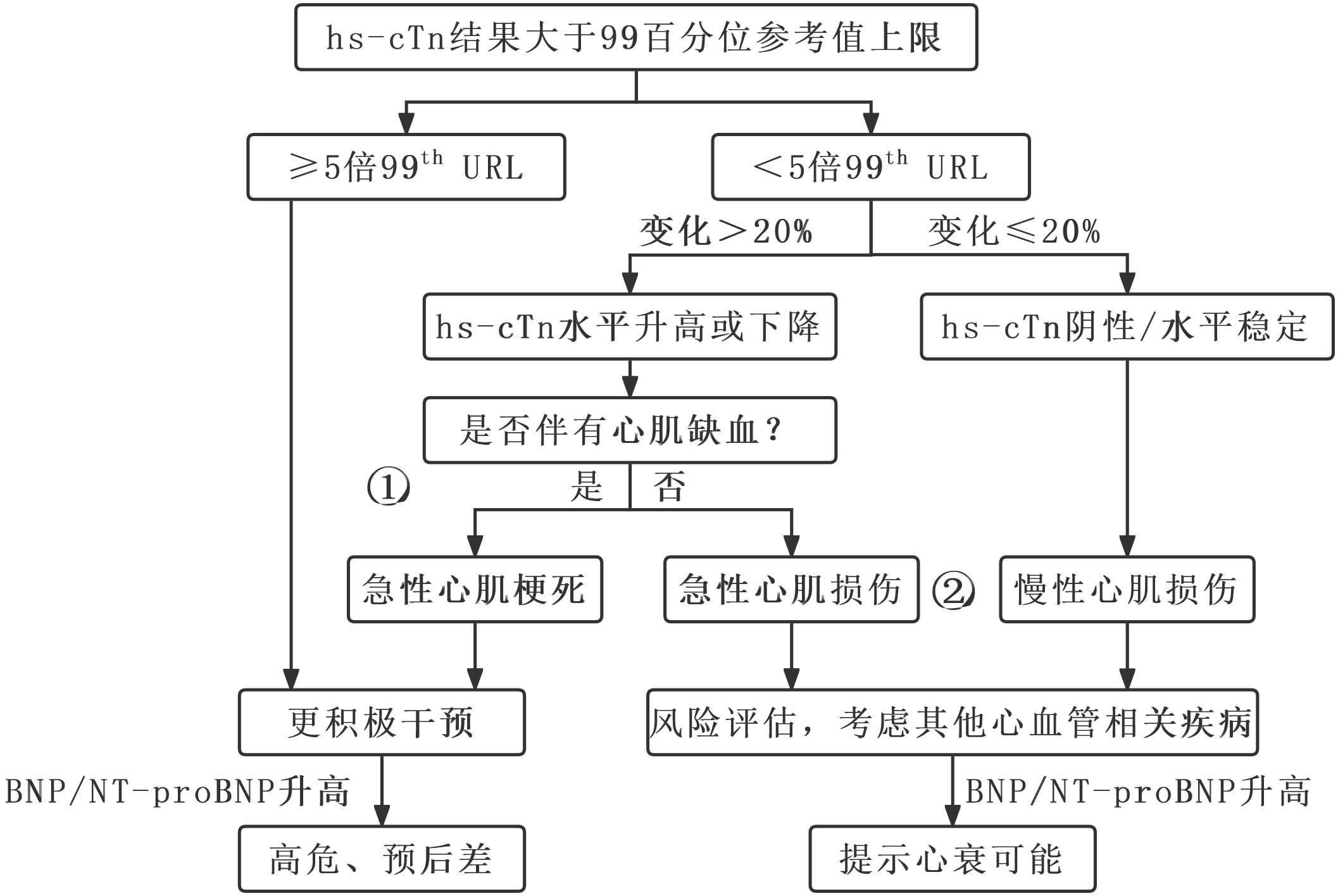 5.2 路径二如果hs-cTn显著上升但小于5倍99th URL且变化值超过20%,但不伴心肌缺血表现;或hs-cTn上升但小于5倍99th URL且变化值不超过20%,应考虑按照急性和慢性心肌损伤进行对症处理,或者积极评估其他心血管疾病可能。如果同时伴有BNP/NT-proBNP升高,则应考虑心衰可能(图 2)。