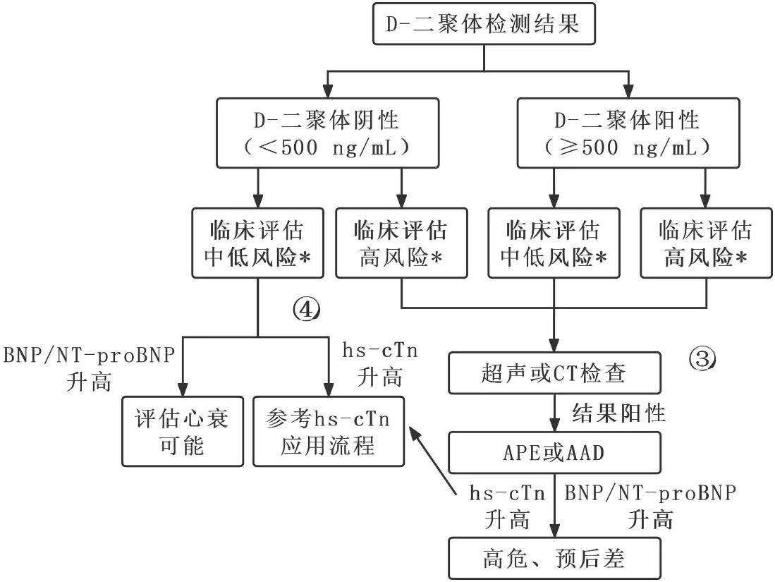 5.4 路径四如果D-二聚体结果为阴性(< 500 ng/mL),且结合临床评估为中、低风险,基本可排除APE/AAD。在此基础上如果同时伴有hs-cTn升高,应考虑冠脉病变可能,进行对应的治疗和处理。如BNP/NT-proBNP明显升高,则应考虑心衰可能(图 3)。