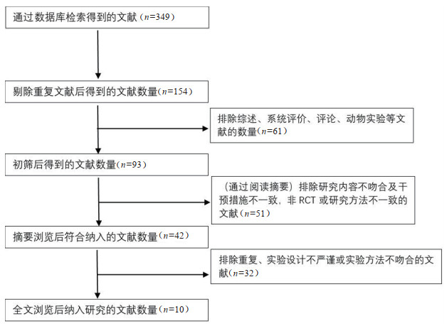 2 结果 2.1 文献纳入情况经检索得到文献349篇,经逐层筛选最终纳入文献10篇[7-16],共797例患者,根据质量评估,10项研究的Jadad得分4到5不等,均为高质量研究。检索流程见图 1,纳入研究的一般资料见表 1。