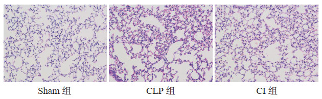 2 结果 2.1 各组间肺组织病理损伤比较HE染色肺组织进行损伤评分,以及通过肺组织W/D比值比较肺水含量,评估比较各组小鼠肺组织病理损伤情况。Sham组肺组织结构清晰,肺泡及肺间质无水肿,无明显炎症细胞浸润;CLP组和CI组均存在不同程度肺损伤,炎症细胞浸润,肺泡透明膜形成,肺间质水肿,CLP组和CI组肺组织肺水含量及肺损伤评分较Sham组均明显升高(P < 0.05);与CLP组比较,CI组肺组织损伤评分则明显降低(P<0.05), 肺水含量也减少(P<0.05)。见表 1、图 1。