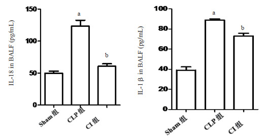 与Sham组比较,肺泡灌洗液IL-1β、IL-18含量在CLP组和CI组明显升高(P<0.01)。与CLP组相比,CI组肺泡灌洗液IL-1β、IL-18含量则明显降低(P<0.05)。见图 2。