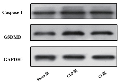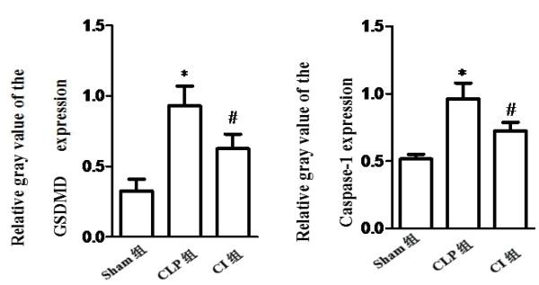 在Sham组小鼠肺组织内caspase-1及GSDMD蛋白表达均较低。与Sham组比较,CLP组和CI组肺组织内caspase-1及GSDMD蛋白表达均明显升高(P均<0.01)。与CLP组比较,给予caspase-1抑制剂干预处理后,CI组caspase-1及GSDMD蛋白的表达较前者明显下降(P<0.05)。见图 3,图 4。