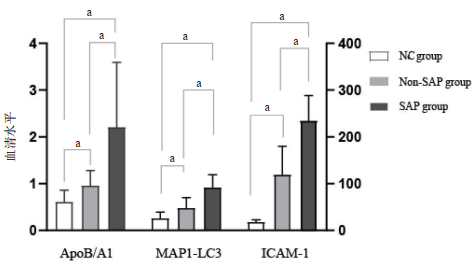 NC组、Non-SAP组以及SAP组患者血清中Apo B/A1水平分别为(0.61±0.27)、(0.96±0.34)和(2.21±1.40), 差异有统计学意义(F =142.29, P < 0.01);MAP1-LC3水平分别为(0.26±0.15) ng/mL、(0.48±0.24) ng/mL和(0.92±0.29) ng/mL, 差异有统计学意义(F =171.72, P < 0.01);ICAM-1水平分别为(19.25±5.12) ng/mL、(120.28±61.69) ng/mL和(235.57±54.50) ng/mL, 差异有统计学意义(F=293.95, P < 0.01)。见图 1。