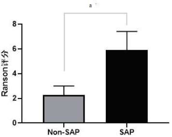 与相应对照组比较,aP < 0.01 图 2 SAP组与Non-SAP组入院后首次Ranson评分比较 Fig 2 Comparison of the first Ranson score after admission between the SAP group and non-SAP group |