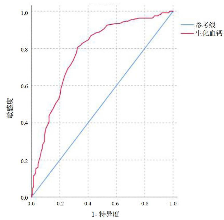 图 1 生化血钙预警老年创伤患者伴发TIC的ROC曲线 Fig 1 ROC analysis of biochemical calcium for predicting TIC in elderly trauma patients |