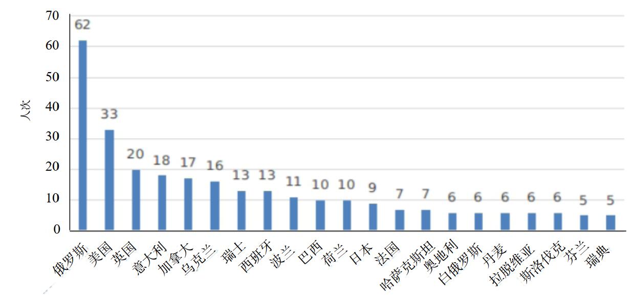 转运人员来自全球50个国家。其中始发地国家入境人员排名第一为俄罗斯62人次,占18.1%,其余结果详见图 3。