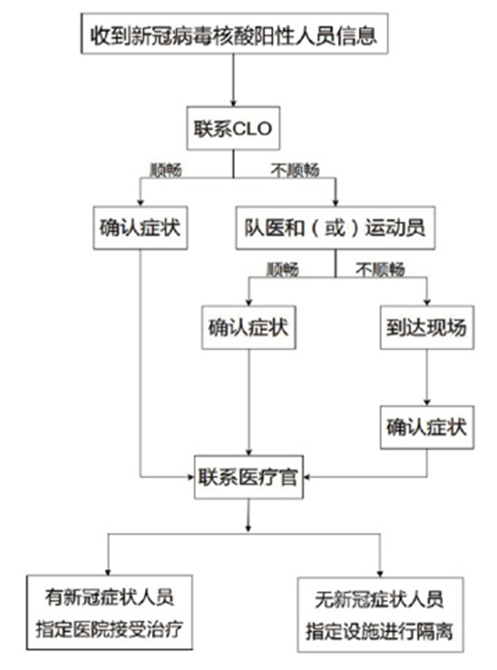 3.2.4 新冠病毒核酸检测阳性处理流程所有参加北京冬奥会和冬残奥会的组织均需设置CLO。CLO的职责是确保相关组织成员了解《防疫手册》内容,协助其完成来华前各项准备工作,并做好疫情应急处置等沟通协调工作[6]。据统计,北京冬奥会和冬残奥会期间入境涉奥相关人员新冠病毒核酸检测阳性463例[8],综合诊所承担延庆冬奥村新冠病毒核酸阳性人员的转运工作,并根据《防疫手册》的要求,制定转运流程(见图 2),在保障新冠病毒核酸阳性人员尽快安全转运同时,也符合疫情防控要求,最终做到综合诊所所有人员新冠零感染。
