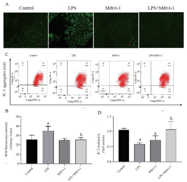 如图 2A-B ,与Control组相比LPS组荧光强度增加,细胞内ROS生成增多(F=14.022,P < 0.05), Mdivi-1组差异无统计学意义(P > 0.05);LPS+Mdivi-1组ROS含量低于LPS组(P < 0.05)。线粒体膜电位检测所示(图 2C-D),与Control组相比,LPS组及Mdivi-1组线粒体膜电位降低(F=7.2295,均P < 0.05),LPS+Mdivi-1组膜电位较LPS组升高(P < 0.05)。