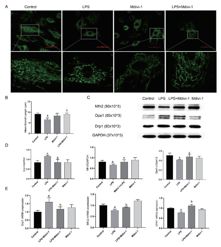 MitoTracker染色显示(见图 3A-B ),与Control组相比LPS组可引起线粒体断裂,平均长度显著缩短(P < 0.05);与LPS组相比,LPS+Mdivi-1组可减少线粒体断裂,线粒体平均长度延长(F=20.742,P < 0.05),Mdivi-1组与Control组间差异无统计学意义(P > 0.05)。Western bolt结果显示(图 3C-D ),与Control组相比LPS组可使线粒体分裂蛋白Drp1表达量上升,融合蛋白Mfn2表达量下降(F=7.386,F=4.266,均P < 0.05);OPA1可水解为L-Opa1与S-Opa1,共同调节粒体融合过程,L-Opa1剪切为S-Opa1时,线粒体融合受抑制[18],与Control组相比LPS组L-Opa1/S-Opa1比值降低(F=3.89,P < 0.05),Mdivi-1组Drp1、Mfn2、Opa1与Control组间均差异无统计学意义(P > 0.05);与LPS组相比Mdivi-1+LPS组分裂蛋白Drp1表达量降低,融合蛋白Mfn2及L-Opa1/S-Opa1表达量上升(均P < 0.05)。实时荧光定量PCR结果显示,与Control组相比,LPS组Drp1 mRNA表达量上升,Mfn2、Opa1 mRNA表达量下降(F=9.956,F=42.692,F=26.53,均P < 0.05),Mdivi-1组Drp1与Opa1mRNA表达量差异无统计学意义(P > 0.05),Mfn2 mRNA表达量上升(P < 0.05),与LPS组相比LPS+Mdivi-1组中Drp1 mRNA表达量下降(P < 0.05),Mfn2、Opa1 mRNA表达量上升(图 3E ,P < 0.05),与Western blot结果一致。