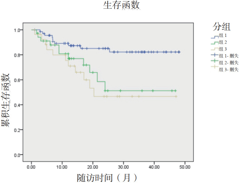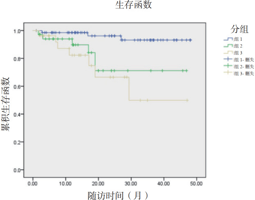 图 1 三组患者脑血管死亡的Kaplan-Meier生存曲线(Log-rank χ2 =13.19,P = 0.001) Fig 1 The Kaplan-Meier survival curve of cerebrovascular mortality in the three groups(Log-rank χ2 =13.19, P = 0.001) |