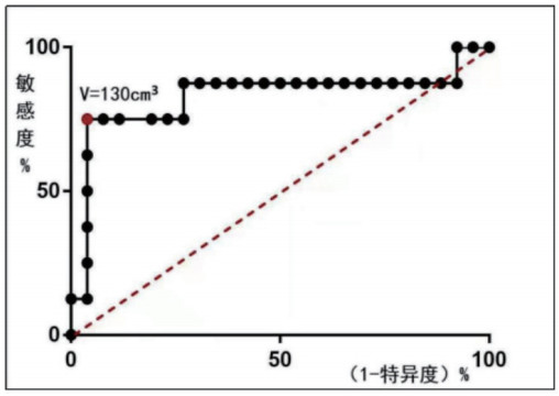 各组平均病灶大小(V)比较:组4的V显著大于组2、组3(P=0.036)。使用V预测治疗方案时当取V=130 cm3可获得最大约登指数(0.71),此时预测敏感度=0.75,特异度=0.96(图 2),提示V>130 cm3在UAE后需接受进腹手术治疗的概率明显上升。