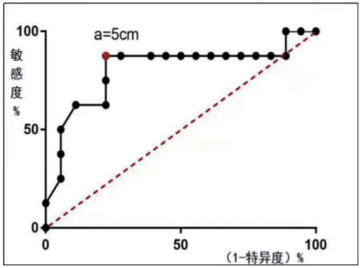 病灶最大径线值(a)亦表现出明显的组间差异,组4平均病灶a显著大于组2、组3(P > 0.05)。以a作为预测是否需后续手术治疗的指标,可取当a=5 cm时获得最佳预测价值灵敏度0.88,特异度0.77,约登指数0.65(图 3)。提示a>于5 cm时需后续进腹手术治疗的概率大。