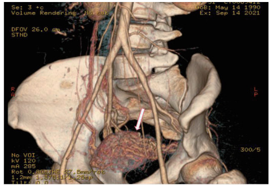 图 4 子宫动脉CTA血管造影:子宫动脉血管迂曲增粗成团(白色箭头)