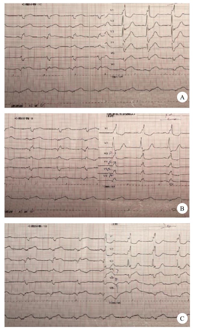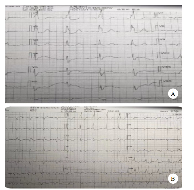 血常规:白细胞数9.46× 109/L,中性粒细胞绝对值8.57× 109/L,红细胞数3.96× 1012 L,血红蛋白118 g/L,血小板数266× 109/L;嗜酸粒细胞绝对值0.0× 109/L;嗜碱性粒细胞绝对值0.4× 109/L;凝血常规:正常范围;D- 二聚体:正常范围;肌钙蛋白:1.26 ng/mL;心肌酶:肌酸激酶890 U/L,肌酸激酶同工酶85 U/L。心脏彩超:节段性室壁运动异常;二尖瓣轻度反流;左室收缩及舒张功能减退(EF:42%);主动脉回声增强;主动脉瓣弹性减退。心电图提示:窦性心律,完全性右束支阻滞,Ⅱ、Ⅲ、avF ST段上抬,心电图见图 1