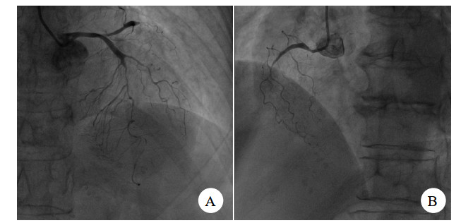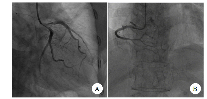 入院后考虑患者起病11 h,仍有胸痛,且心电图Ⅱ、Ⅲ、avF ST段上抬,故有急诊介入治疗手术指征,遂与患者家属交代病情,签署知情同意书后安排急诊介入手术。急诊介入过程见图 2图 3