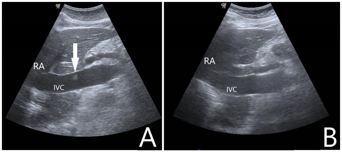 A:箭头显示超声下在下腔静脉处附壁漂浮的血栓;B:经治疗后超声在下腔静脉未见明显异常回声;RA:右心房,IVC:下腔静脉 图 1 撤离ECMO 1 d后行下腔静脉超声检查 |