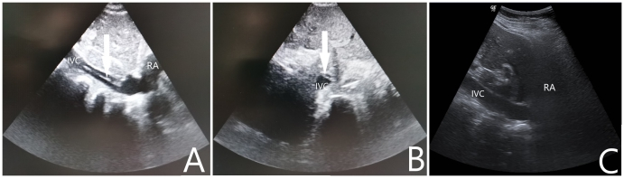 A:下腔静脉纵向超声扫描显示下腔静脉至右心房入口有血栓形成;B:下腔静脉水平超声扫描显示下腔静脉内漂浮的血栓影;C:经治疗后超声在下腔静脉未见明显异常回声;RA:右心房,IVC:下腔静脉 图 2 撤离ECMO后即刻行下腔静脉超声检查 |