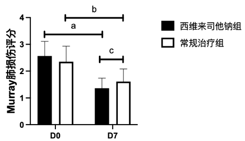 治疗7 d后的Murray肺损伤评分,西维来司他钠组与治疗前比较,aP<0.0001;常规治疗组与治疗前比较,bP<0.0001;西维来司他钠组与常规治疗组比较,cP<0.05 图 1 ALI治疗7 d后的Murray肺损伤评分 Fig 1 Murray lung injury score after 7 days of ALI treatments |