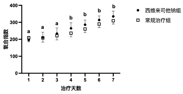 西维来司他钠组与常规治疗组氧合指数比较,治疗第1、2、3天,aP>0.05;治疗第4、5、6、7天,bP<0.05 图 2 ALI治疗7 d内的氧合指数(PaO2/FiO2) Fig 2 Oxygenation index (PaO2/FiO2) within 7 days of ALI treatments |