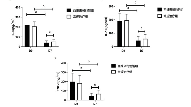 治疗7 d后,西维来司他钠组和常规治疗组炎症因子比较,A:IL-6与治疗前比较,aP<0.05,bP<0.05;两组间IL-6比较,cP<0.05;B:IL-10与治疗前比较,aP<0.05,bP<0.05;两组间IL-10比较,cP<0.05;C:TNF-α与治疗前比较,aP<0.05,bP<0.05;两组间TNF-α比较,cP<0.05 图 3 ALI治疗7 d后炎症因子 Fig 3 Inflammatory cytokines after 7 days of ALI treatments |