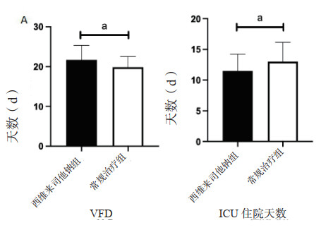 西维来司他钠组与常规治疗组比较,A: VFD更长,aP<0.05; B: ICU住院天数更少,aP<0.05 图 4 ICU收治期内无呼吸机天数(VFD)及ICU住院天数 Fig 4 Ventilator-free days (VFD) and ICU stay days during ICU admission |