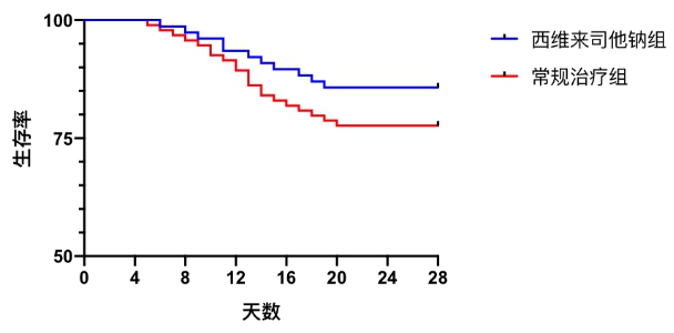 与常规治疗组比较,西维来司他钠组ALI患者病死率呈下降趋势,但两组间病死率差异无统计学意义 图 5 两组间28 d生存率比较 Fig 5 Comparison of 28-day survival rates between the two groups |