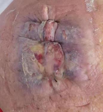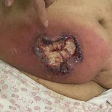 坏疽性脓皮病(pyoderma gangrenosum, PG) 是一种罕见的自身炎症反应性溃疡型皮肤病,其总体发病率约为每5. 8/100 000人[1-2]。PG存在多种亚型,其中手术后型PG通常发生在术后2周左右[3]。近年来,国内PG相关病例偶有报道,但手术后型鲜见。以下是一个78岁女性的病例报道[该研究已通过免除知情同意申请,伦理审批号:Y(2022)037]。患者于外院诊断“急性阑尾炎”后行阑尾切除术。术后出现了切口红肿、疼痛等感染类似表现,经对症用药后未见好转,遂转本院就诊。