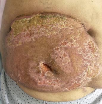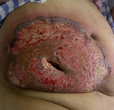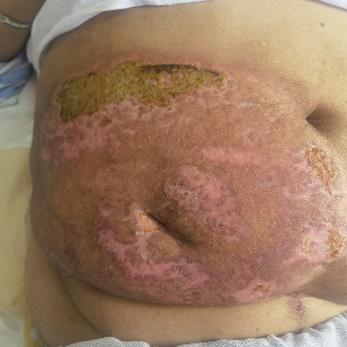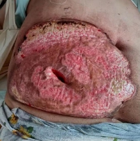 1 资料与方法患者女性,78岁,诊断为“急性阑尾炎”并于当地医院取右下腹斜切口行阑尾切除术,术后早期未见异常。术后第6天,患者开始出现发热,同时有术区切口红肿疼痛,延迟愈合。予以积极抗感染治疗后未见好转,遂转本院。就诊时切口未拆线,术区皮肤水肿,有少量渗出,可观察到表皮溶解和青紫色缺血样改变,触痛明显(图 1)。初步诊断“腹壁软组织感染”,拆除切口缝线并以手指探查切口内侧分隔脓腔,仅有少量稀薄脓液溢出,皮下组织未见脓苔覆盖,以生理盐水充分冲洗后纱布蘸净,油纱填充。主治医师每日换药,切口内渗出极少,但术区周围皮肤破溃面积迅速增大:入院后第2天,病损范围为直径10 cm(图 2),第4天增大至20 cm(图 3),第11天已达26 cm×16 cm(图 4)。在此期间,患者创面渗出逐渐增多,触痛明显。反复留取创面组织送细菌培养均提示阴性。查腹部CT未见皮下积脓或腹腔内感染灶。原手术切口愈合延迟。综合分析,考虑病变为非感染因素导致。经多次多学科会诊后,高度疑诊为手术后型PG。给予全身性类固酮激素(甲泼尼龙琥珀酸钠60 mg/d)治疗,并取局部组织送病理检查。经激素治疗后患者术区疼痛迅速缓解,观察病损扩张速度明显得到控制。复查患者血常规提示白细胞计数接近正常水平,抗生素治疗停止。