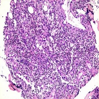 在之后的诊治中,患者病情继续好转。使用激素治疗后第3天,病损范围停止增长(图 5)。第17天,大部分创面已干燥结痂并生长出新鲜皮肤组织(图 6)。第35天,患者激素已逐渐减量至28 mg/d口服,绝大部分创面已干燥结痂,新鲜皮肤下可见青紫色血管影,原手术切口已基本愈合(图 7)。此外,病理回报送检组织除大量中性粒细胞浸润外未见异常(图 8)。患者以“手术后型PG”为诊断出院,继续口服用药并随访2周后告知创面完全愈合。
