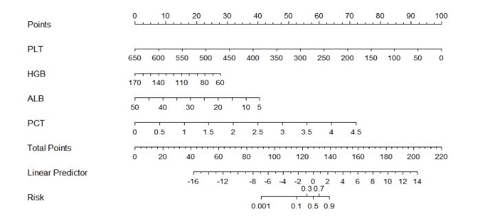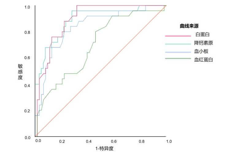 血清白蛋白、降钙素原、血小板及血红蛋白对应的ROC曲线下面积分别为0.896、0.887、0.838、0.696。测算得血清白蛋白阈值为33.9(灵敏度=1.000,特异度=0.683),PCT阈值为0.552(灵敏度=0.958,特异度=0.710),血小板阈值为113.5(灵敏度=0.800,特异度=0.778),血红蛋白阈值129.5(灵敏度=0.800,特异度=0.500)。