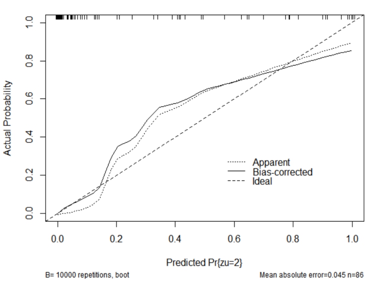 图 3 恙虫病发生MODS预测模型校准图 |